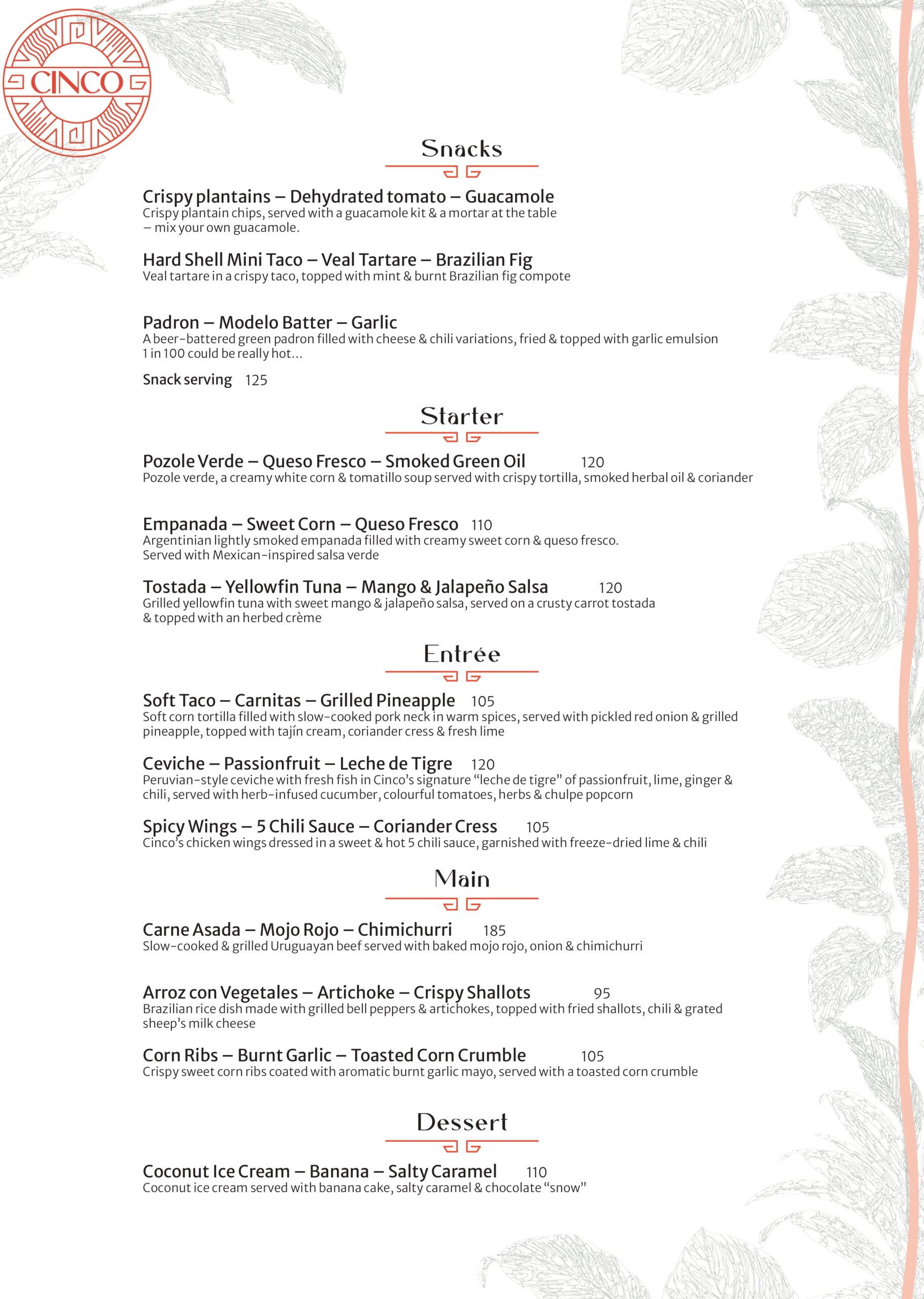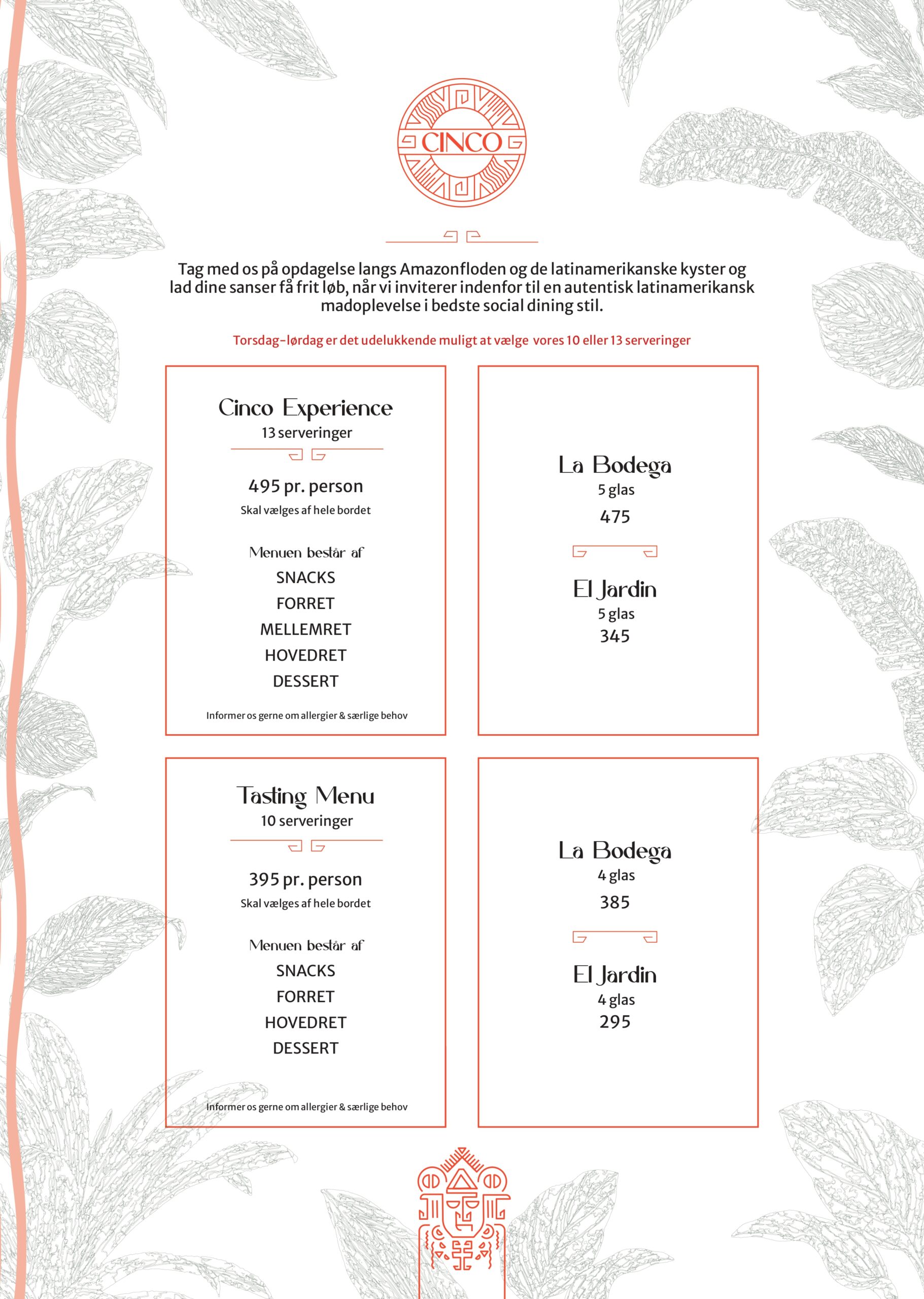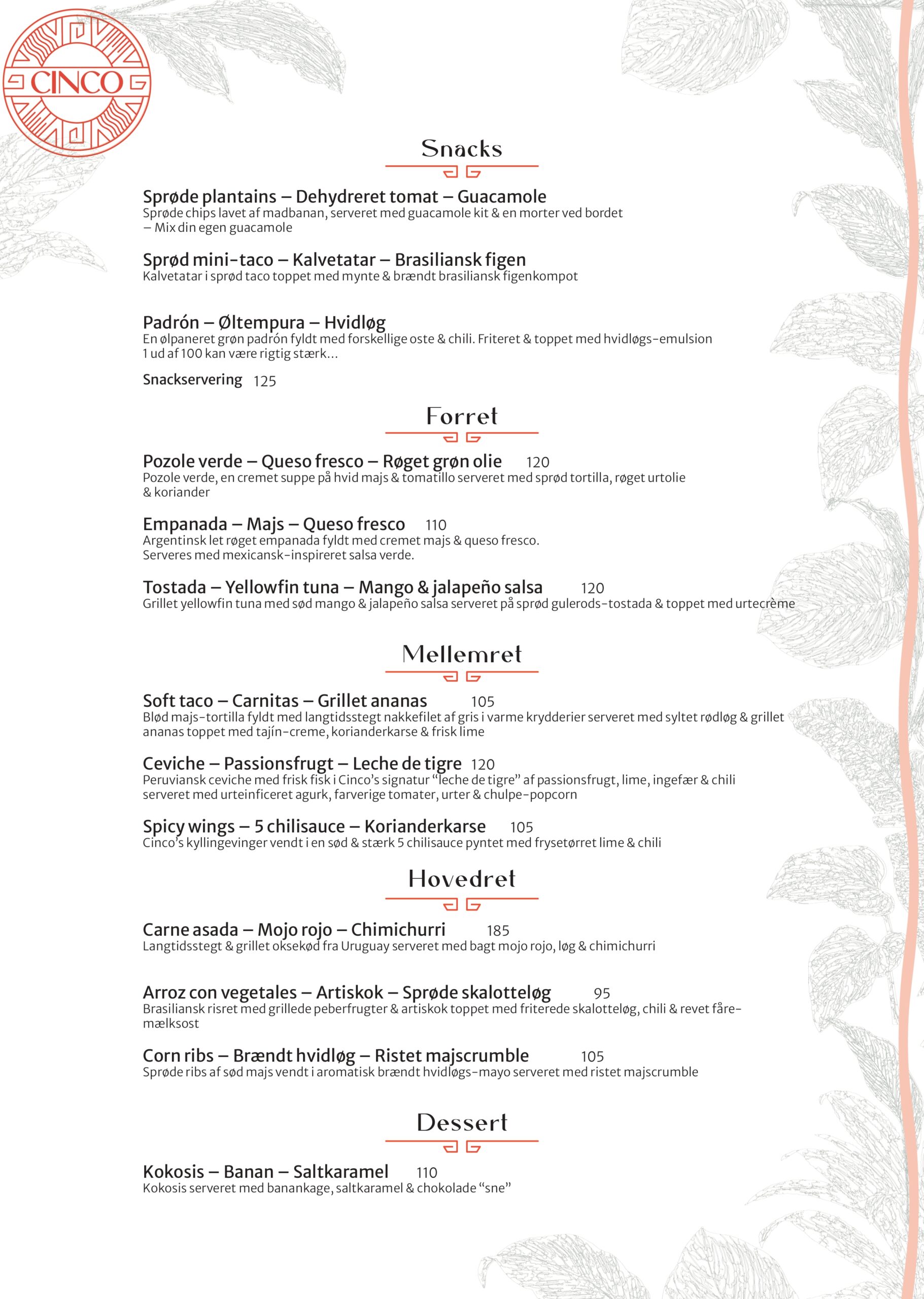 Hos Cinco tager vi udgangspunkt i Nordens lækre råvarer og forvandler dem til en autentisk latinamerikansk madoplevelse. Menuen består af hhv. 13 og 10 serveringer, der alle efterlader dig med intense og varme smagsindtryk, som du kender dem fra det latinamerikanske kontinent.
