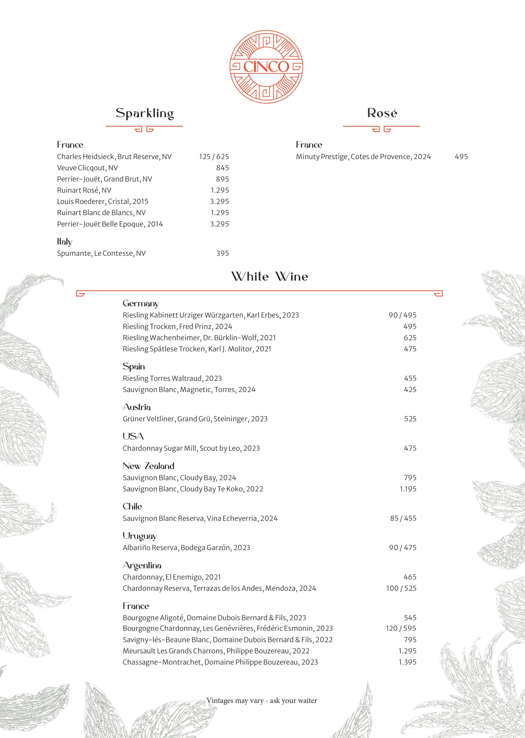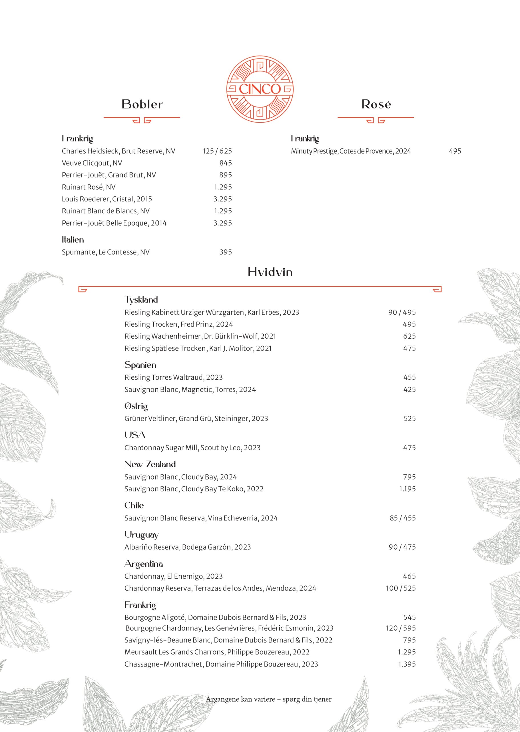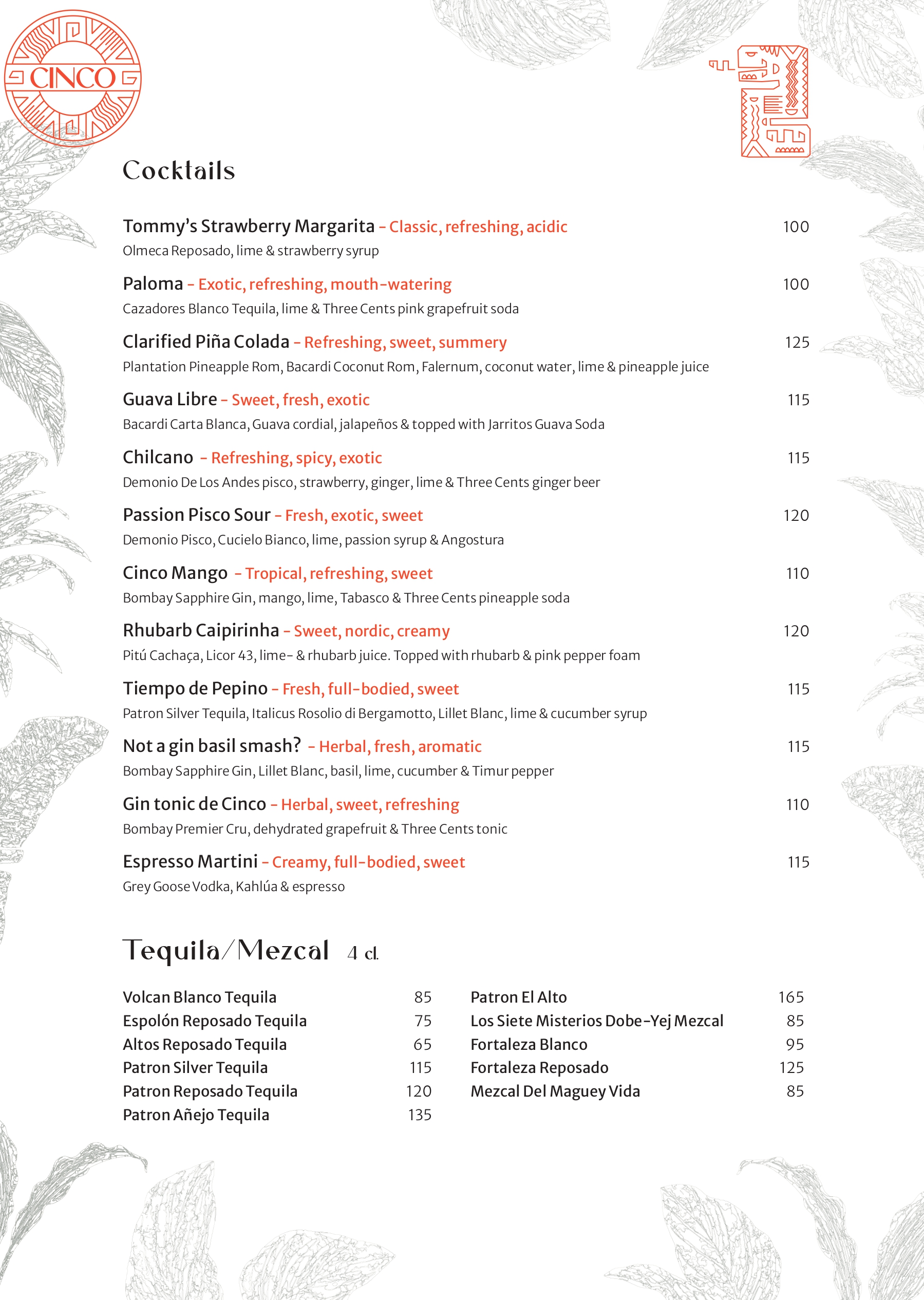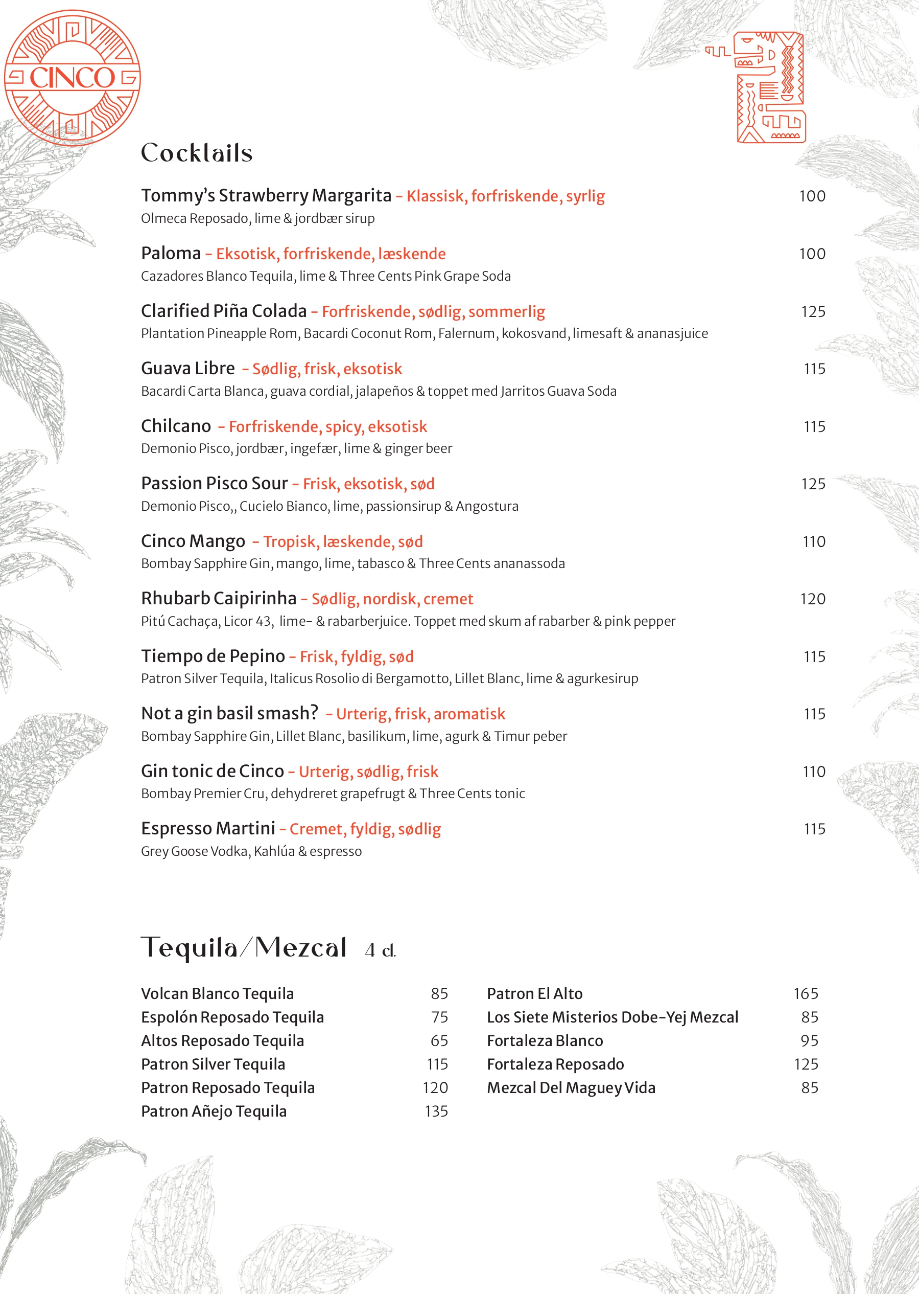 Hos Cinco tager vi udgangspunkt i Nordens lækre råvarer og forvandler dem til en autentisk latinamerikansk madoplevelse. Menuen består af hhv. 13 og 10 serveringer, der alle efterlader dig med intense og varme smagsindtryk, som du kender dem fra det latinamerikanske kontinent.